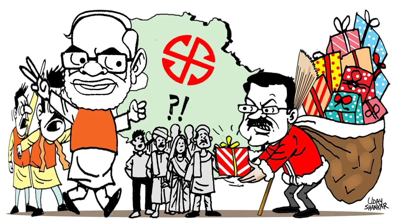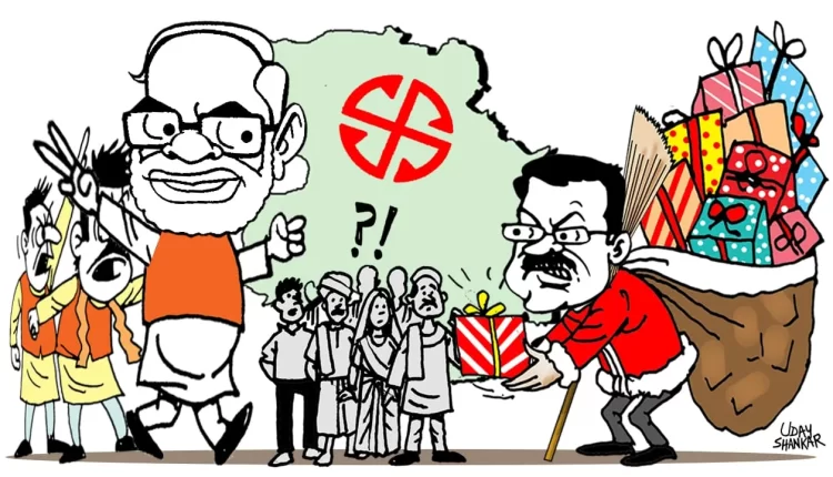 बीजेपी ने अपने संकल्प पत्र में आम आदमी पार्टी के वादे से दो कदम आगे बढ़कर ऐलान किये- जिनमें गरीब महिलाओं को 2500 रुपये, गर्भवती महिलाओं को 2100, 6 पोषण किट, गरीब महिलाओं को 500 में सिलेंडर, होली-दिवाली पर फ्री सिलेंडर, बुजुर्गों का 10 लाख तक का फ्री इलाज, आयुष्मान कार्ड से केंद्र से 5 लाख और राज्य से 5 लाख तक का इलाज, 60 से 70 साल के बुजुर्गों को हर महीने 2500 तो 70 वर्ष से ऊपर के बुजुर्गों को 3000 रुपये की पेंशन, अटल कैंटीन योजना के तहत झुग्गियों में 5 रुपये में खाना आदि. इन योजनाओं ने दिल्ली में बाजी पलट दी.