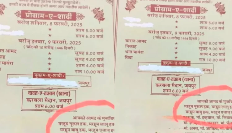 राजस्थान के जयपुर में होने वाली शादी का कार्ड सोशल मीडिया पर जमकर वायरल हो रहा है. शादी आज यानी 9 फरवरी को है. लेकिन शादी से ज्यादा उसके निमंत्रण कार्ड की चर्चा लोगों के बीच हो रही है. शादी का कार्ड जिस मेहमान के पास पहुंचा है वह उसे पढ़कर असमंजस की स्थिति में हैं. कार्ड में छपे कुछ नाम ऐसे हैं जिनको पढ़कर सभी हैरान हैं, ये शादी में आने वाले मेहमानों के आने की उम्मीद लगाए बैठे हैं, लेकिन वह मृतक हैं.