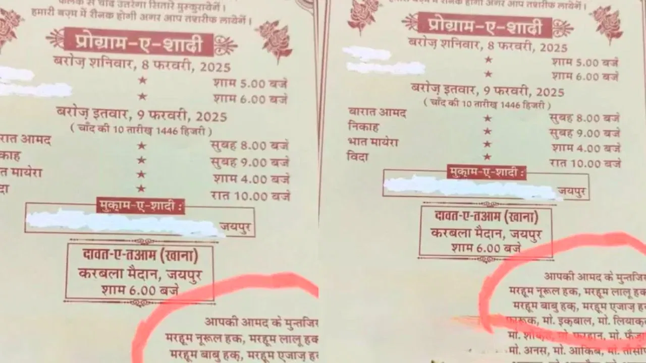 इस समय एक शादी का कार्ड वायरल हो रहा है, जिसमें लड़के ने अपने मेहमानों को यह शादी का कार्ड दिया है. इसमें कुछ ऐसा लिखा है जिसे पढ़कर लोग शादी समारोह में जाने से डरेंगे. यह अनोखा कार्ड अब सोशल मीडिया पर चर्चा का विषय बन गया है.हाल ही में फेसबुक पेज फाइक अतीक किदवई पर एक शादी का कार्ड पोस्ट किया गया है. यह शादी 9 फरवरी 2025 को है. शादी जयपुर में है और कार्यक्रम करबला के मैदान में है. लोगों का ध्यान कार्ड में ‘आमद के मुंतजिर’ पर लिखे नामों पर है. हिन्दी में इसका अर्थ है, ‘देखने की इच्छा रखने वाला.’
