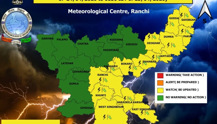 मौसम केंद्र, रांची के अनुसार 23 अप्रैल तक मौसम शुष्क ही बना रहेगा, लेकिन 24 अप्रैल से मौसम करवट लेने लगेगा. 24 अप्रैल को आंशिक बादल छाने के साथ पूर्वी झारखंड में कहीं-कहीं हल्की बारिश या गरज के साथ छींटे पड़ सकते हैं. 25 अप्रैल को उत्तर-पूर्वी, मध्य और दक्षिणी हिस्सों में हल्की से मध्यम दर्जे की बारिश और गरज के साथ तेज हवाएं चलने की संभावना है. 26 अप्रैल को राज्य के कई हिस्सों में बारिश और गर्जन के साथ मौसम सुहाना हो सकता है. 24 से 26 अप्रैल के बीच राज्य के अलग-अलग हिस्सों में 30 से 50 किमी प्रति घंटे की रफ्तार से तेज हवाएं चल सकती हैं और वज्रपात की भी आशंका है.